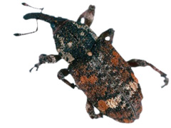 À l'âge adulte, le charançon mesure environ 8 mm (0,31 pouce) de longueur. Ce coléoptère est brun foncé avec des taches blanches et havane sur le dos. On le reconnaît à sa pièce buccale appelée rostre, qui est recourbée et pointue.